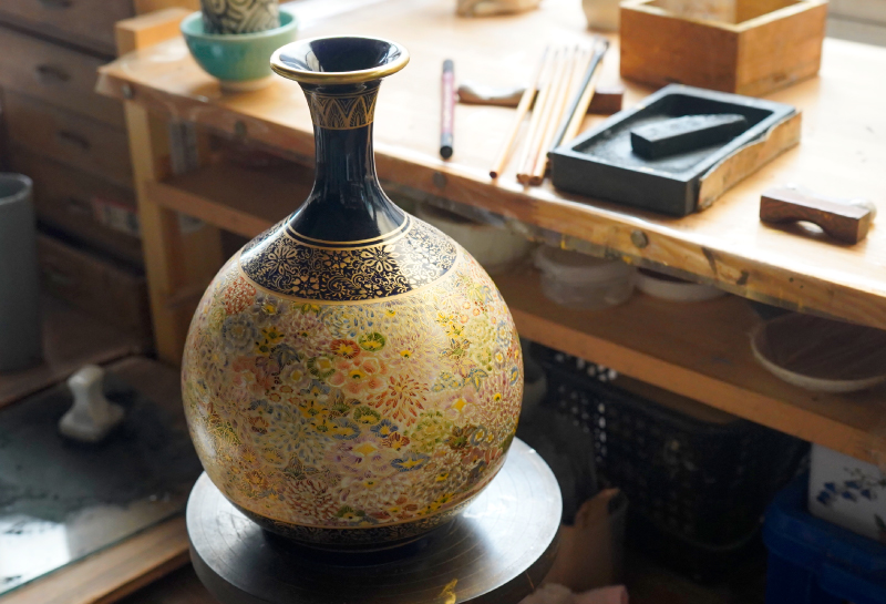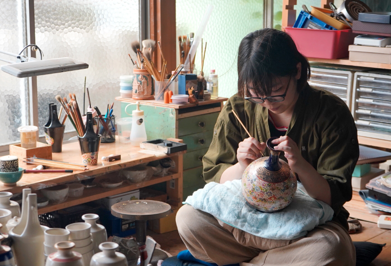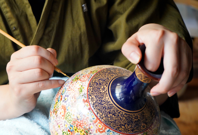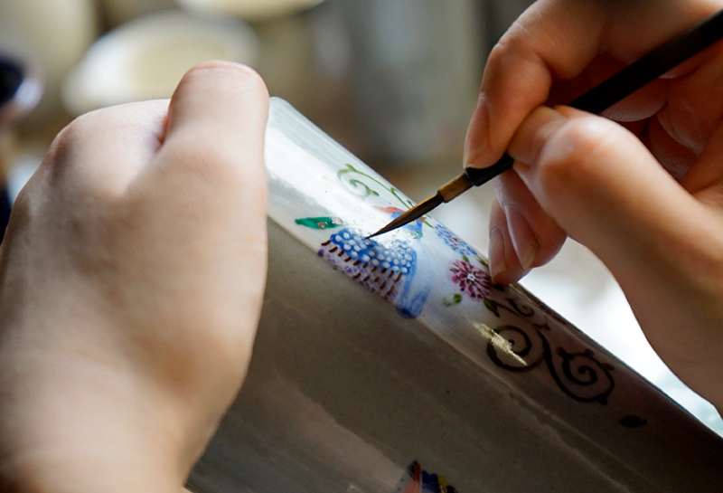 今回は白化粧を施した部分に瑞鳥が花唐草をくわえて羽ばたく様子を上絵の具と金彩で描きました。